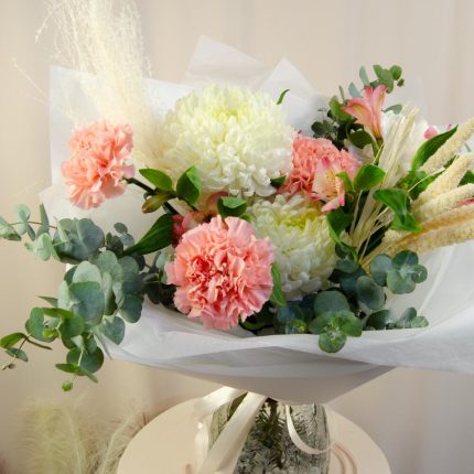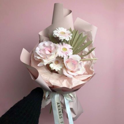Авторский букет с пионовидными розами, пионом и Герберами «Айс латте»