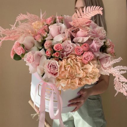 Цветы в коробке с гортензией,пион розами,матиолой,альстромерией,эустомой,колосьями пшеницы и эвкалиптом