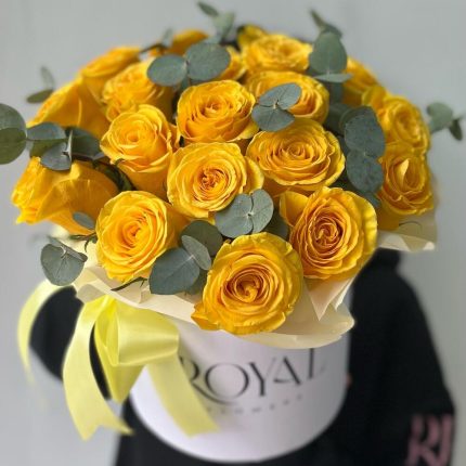 Яркая композиция из французских роз Найтингейл, хризантемы Момоко, ароматных нарциссов и маттиолы с эвкалиптом в коробке