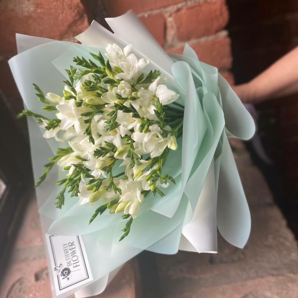 Букет из 27 белых фрезий в стильной упаковке “Перт”