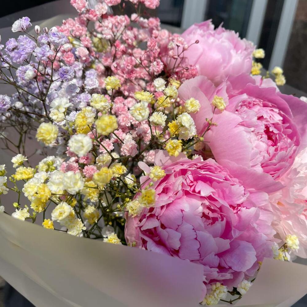 Милый букет из розовых пионов и радужной гипсофиллы в элегантной упаковке