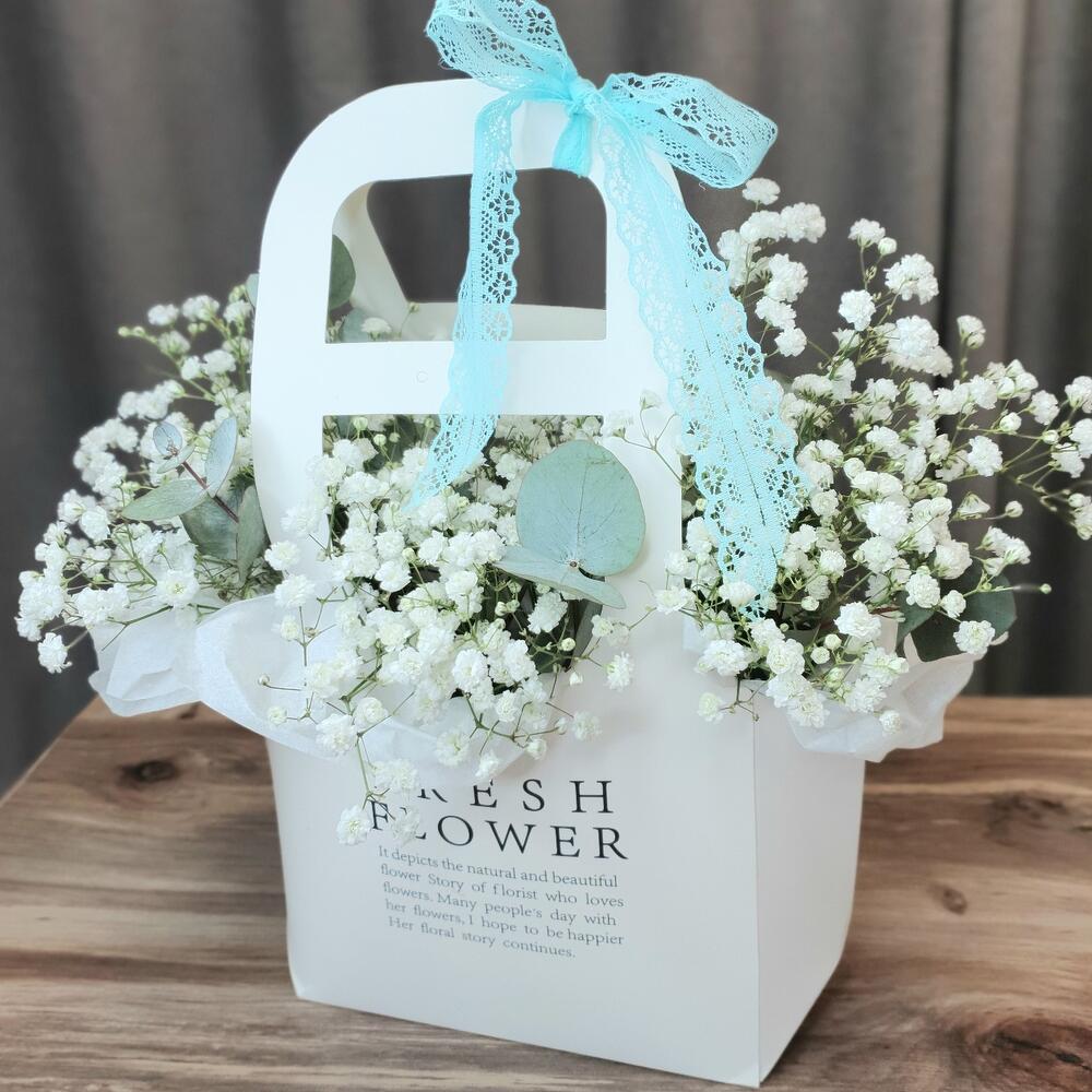 Лента Кружево – 1 шт.Эвкалипт пучок – 1 шт.Оазис флористический – 1 шт.сумочка декоративная – 1 шт.Гипсофила – 4 шт.