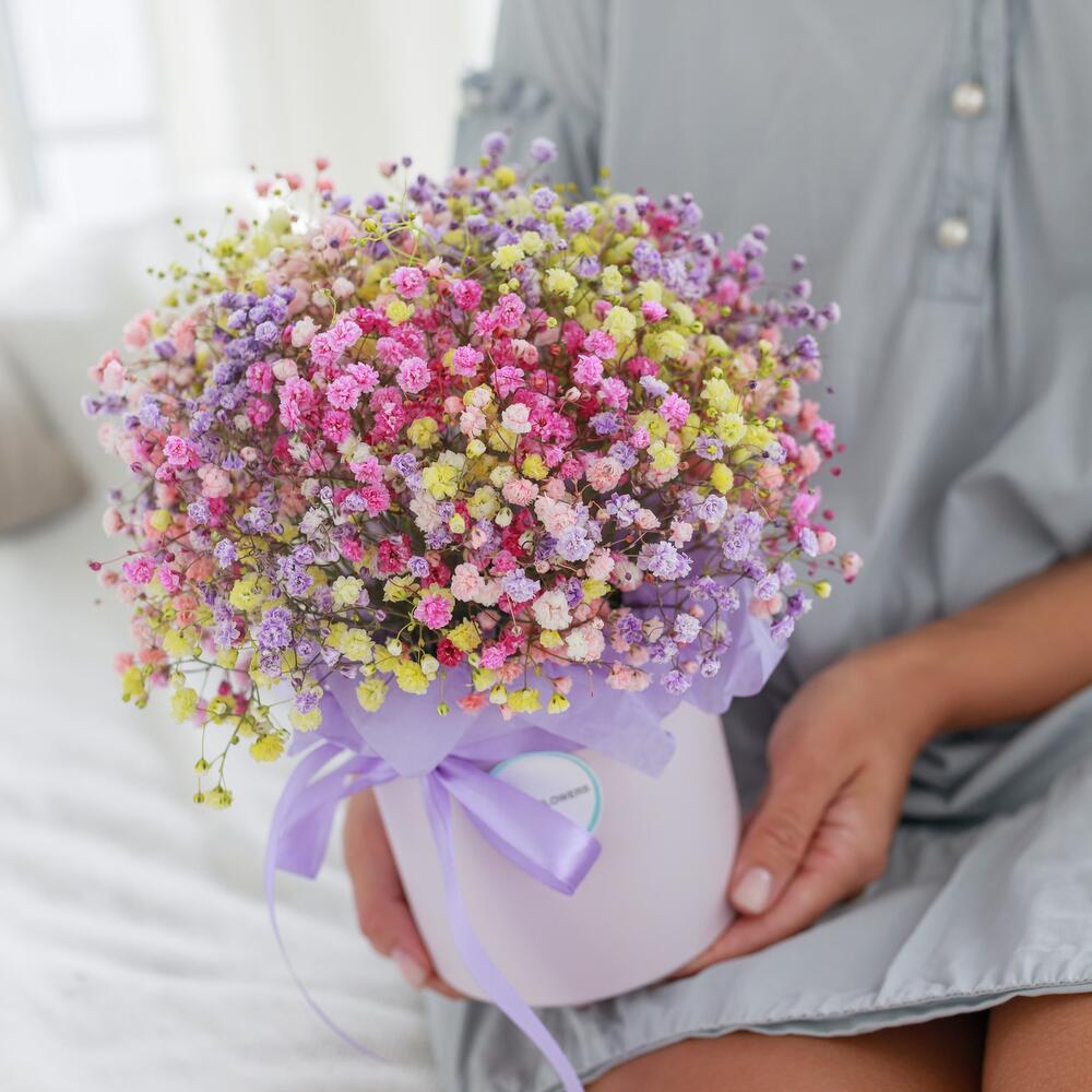 Очаровательная, воздушная композиция из гипсофилы, в шляпной коробке.Цветы стоят в специальной флористической губке,что позволяет им больше оставаться свежими и радовать получателя. Так же композиция в коробке это очень удобно и эффектно, так как не надо ставить букет в вазу и менять воду. Необходимо лишь подливать в губку воду.Инструкция по уходу за цветами прикреплена к каждому заказу.Цветы гипсофилы отличаются стойкостью и даже при высыхании не теряют, декоративности и цвета. Что позволяет, долгое время украшать интерьер в качестве сухоцветов.Подпишем открытку с вашими пожеланиями бесплатно