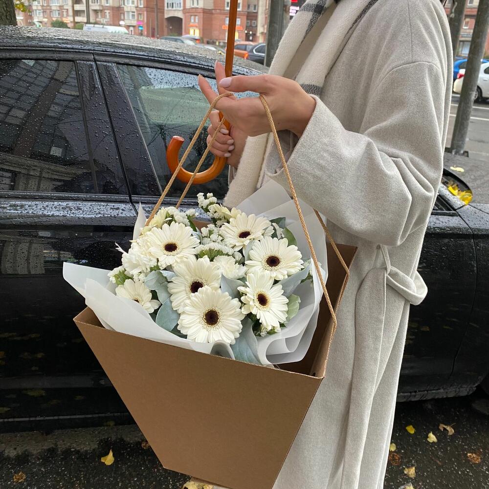 Гербера – 9 шт.Статица – 2 шт.Салал – 5 шт.Упаковка – 3 шт.Гвоздика – 3 шт.Сумка крафт – 1 шт.