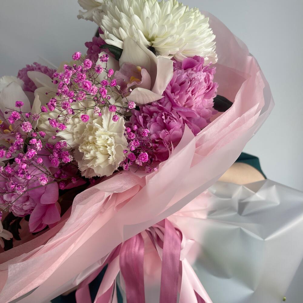 Гипсофила – 1 шт.Орхидея Цимбидиум – 3 шт.Пион – 6 шт.Хризантема – 5 шт.Тишью – 4 шт.Фисташка – 3 шт.Пленка матовая – 6 шт.Диантус сортовой – 3 шт.