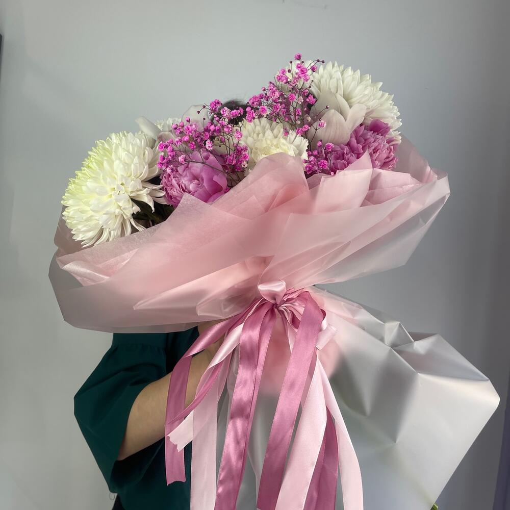 Букет с пионами и хризантемой в дизайнерском оформлении