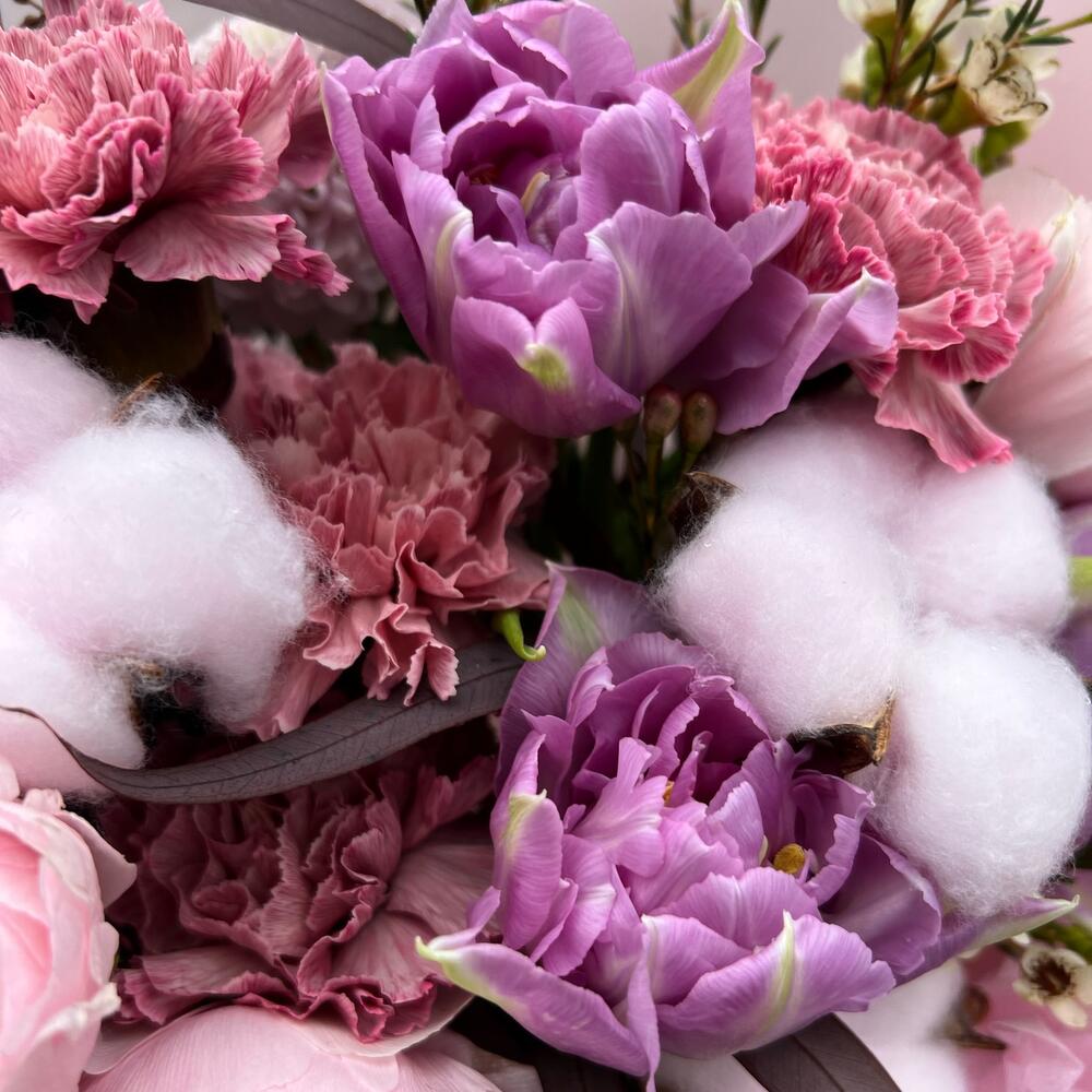 Ранункулюс – 3 шт.Хризантема одноголовая – 2 шт.Диантус – 4 шт.Тюльпан пионовидный – 3 шт.Хлопок (сухоцвет) – 3 шт.Хамелациум – 2 шт.Эвкалипт – 1 шт.Упаковка дизайнерская – 2 шт.Лента атласная – 1 шт.