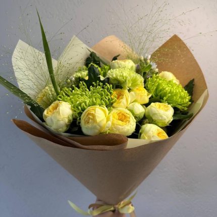 Букетик из пионовидных роз Охара, лизиантусов и озотамнуса