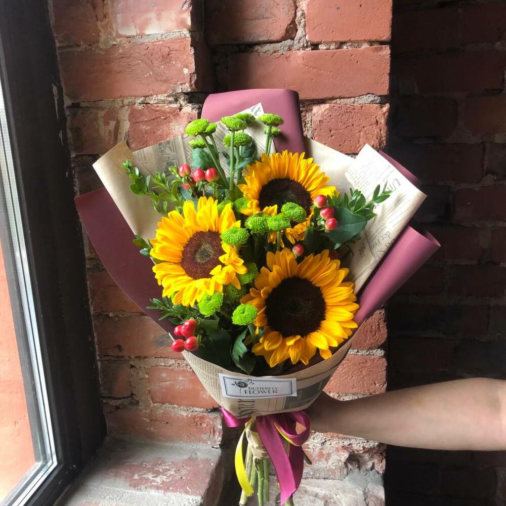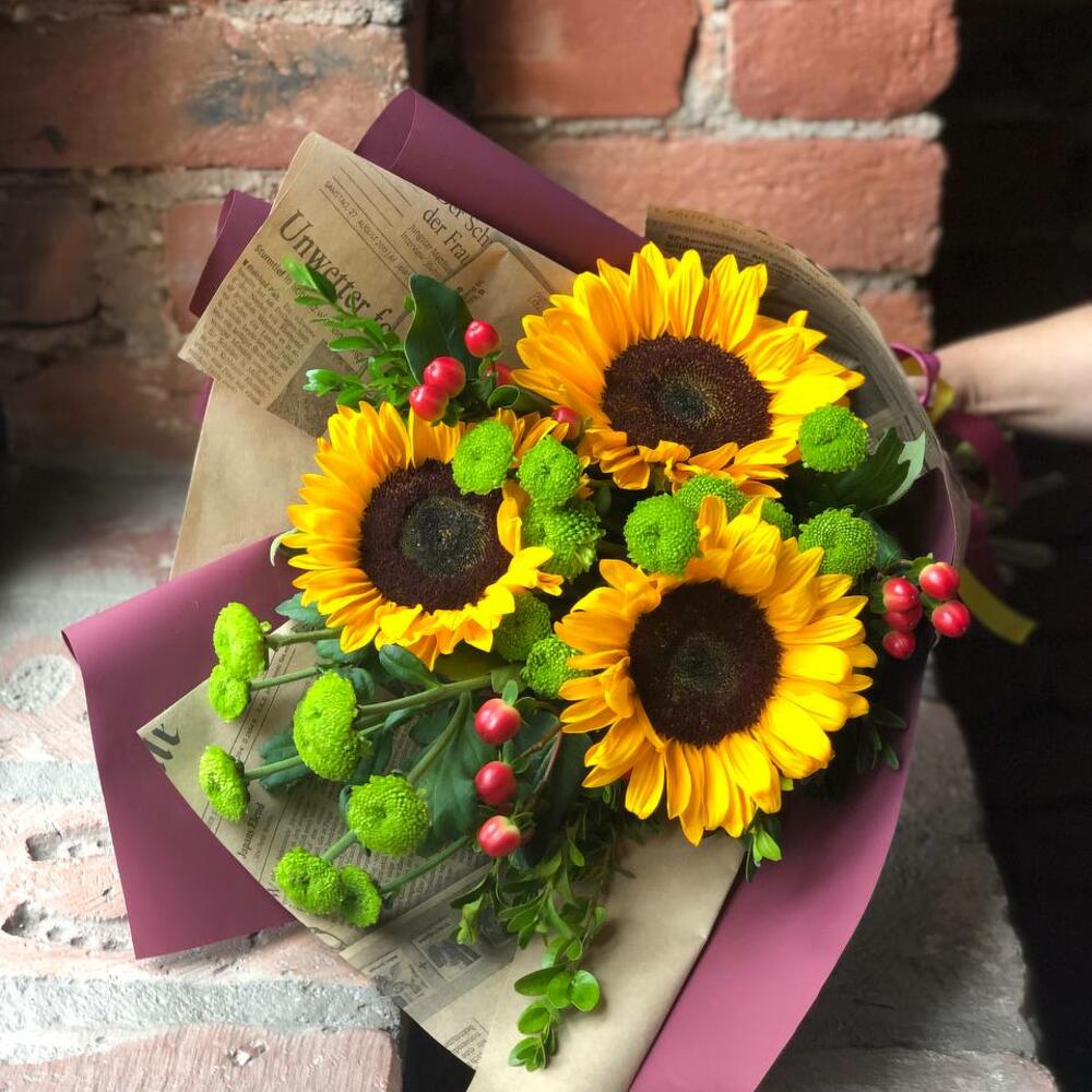 Гиперикум – 3 шт.Хризантема кустовая – 3 шт.Упаковка – 2 шт.Подсолнух – 3 шт.Самшит – 2 шт.