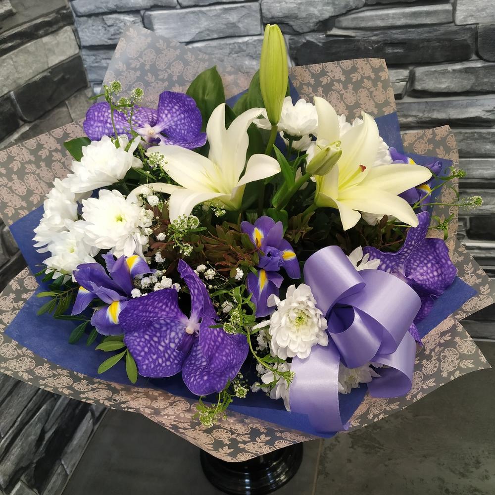 Орхидея Ванда – 3 шт.Хризантема кустовая – 3 шт.Азиатская лилия – 1 шт.Ирис – 3 шт.Фисташка – 1 шт.Зелень – 1 шт.Упаковка дизайнерская – 1 шт.Лента атласная – 1 шт.Гринбелл – 1 шт.Гипсофила – 1 шт.