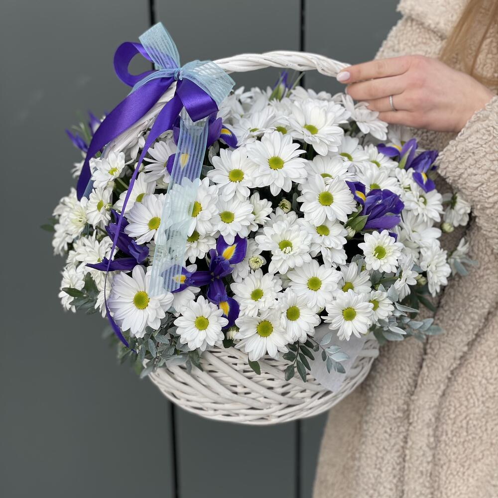 Корзина – 1 шт. Писташ – 6 шт. Хризантема – 11 шт. Оазис – 2 шт. Оформление – 1 шт. ирисы – 9 шт.