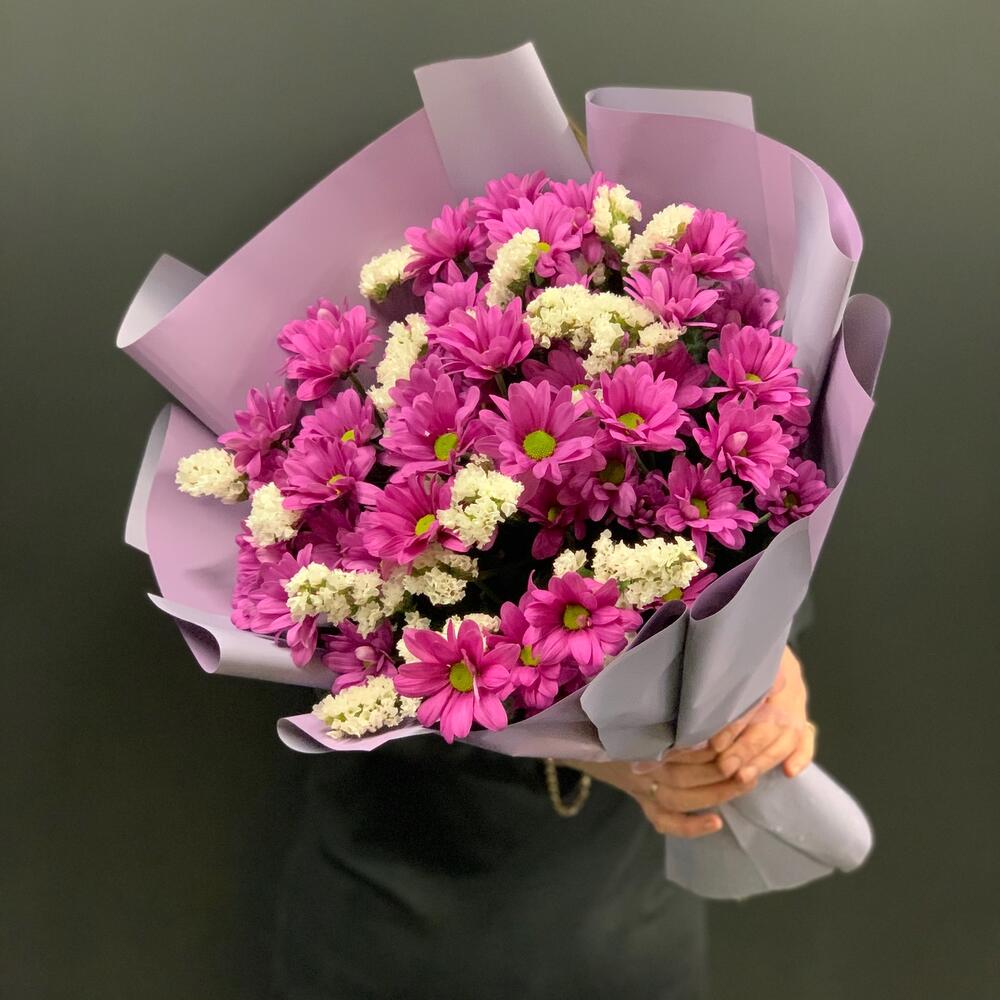 Хризантема кустовая – 7 шт.Статица – 2 шт.Упаковка дизайнерская – 1 шт.