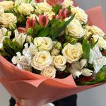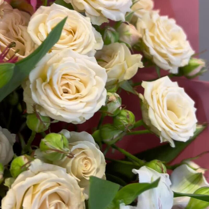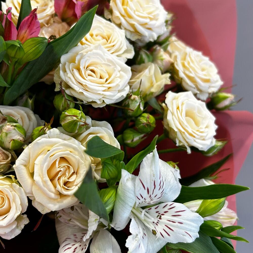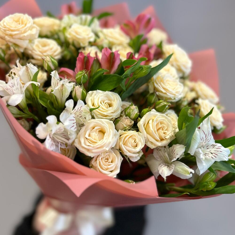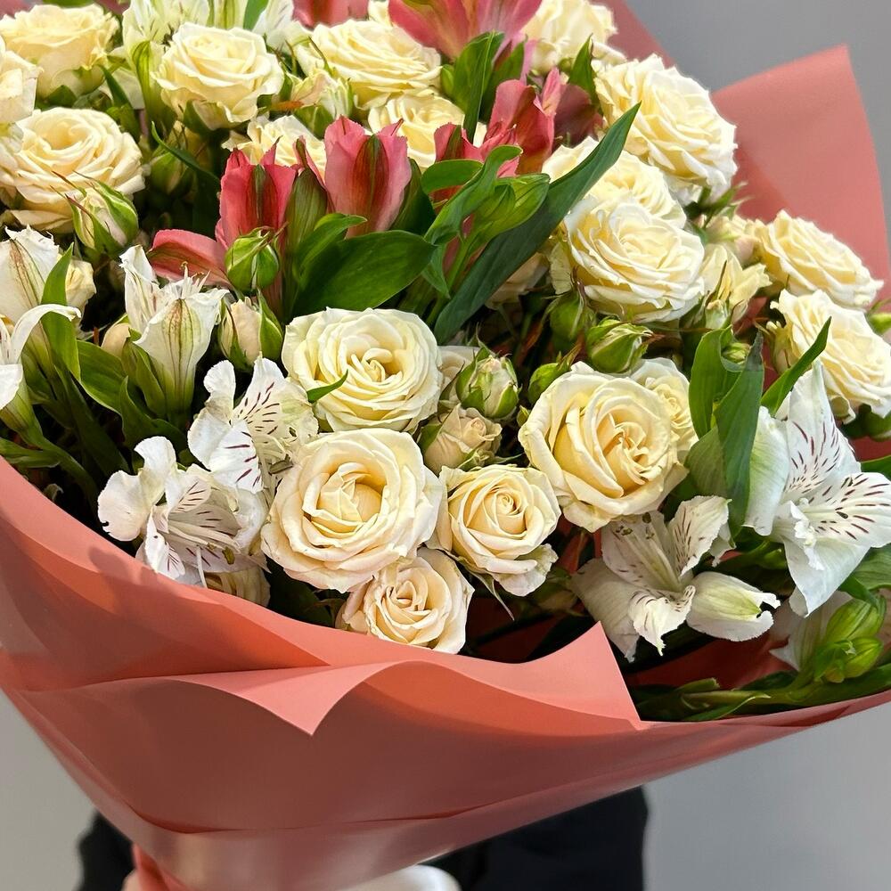 Букет из кремовых кустовых роз и альстромерии