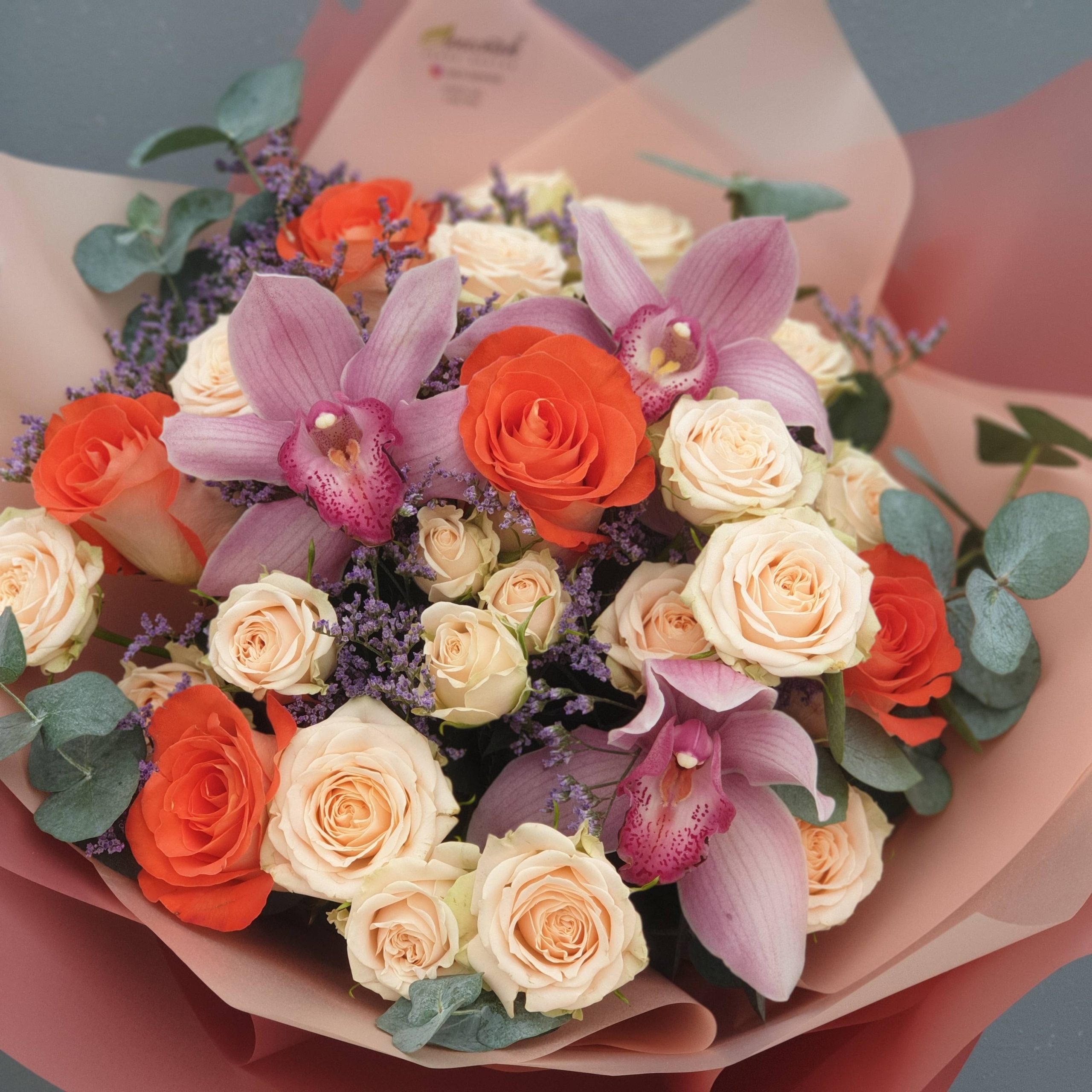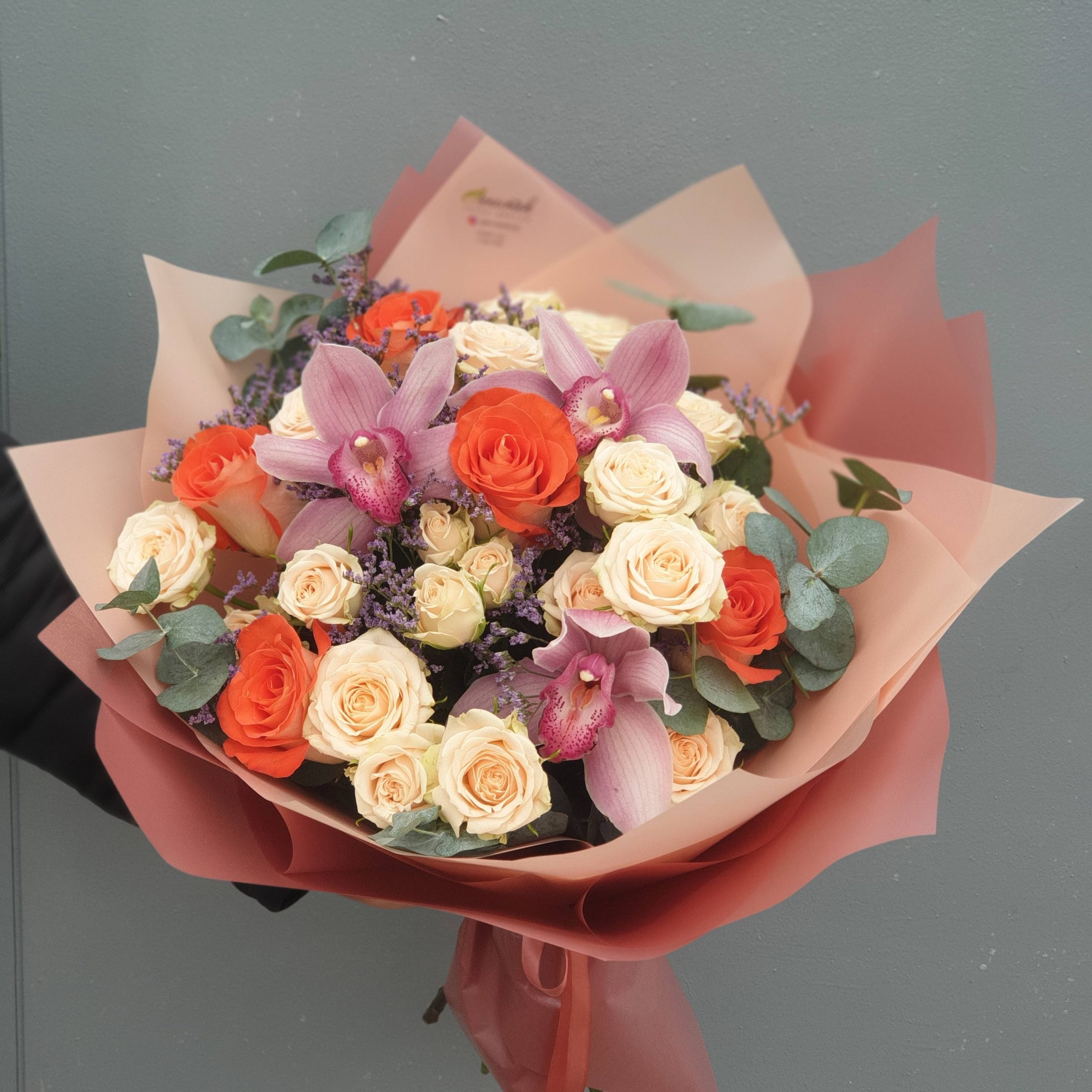 Альстромерии, Кустовые розы, Орхидеи, Розы, Хризантемы
