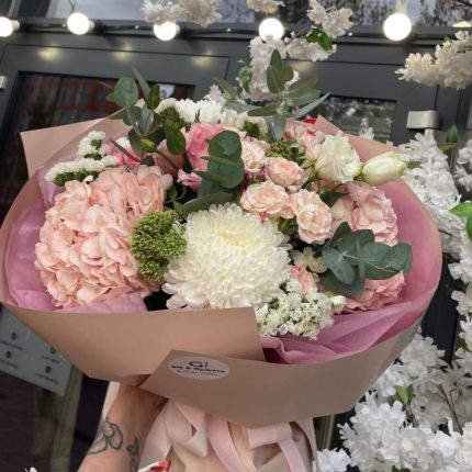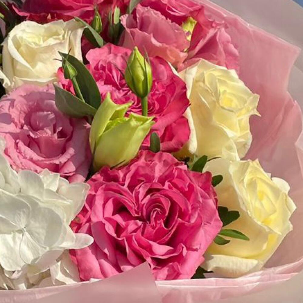 Гортензия – 1 шт. белые розы – 3 шт. пионовидные розы – 5 шт. Лизиантус – 2 шт.