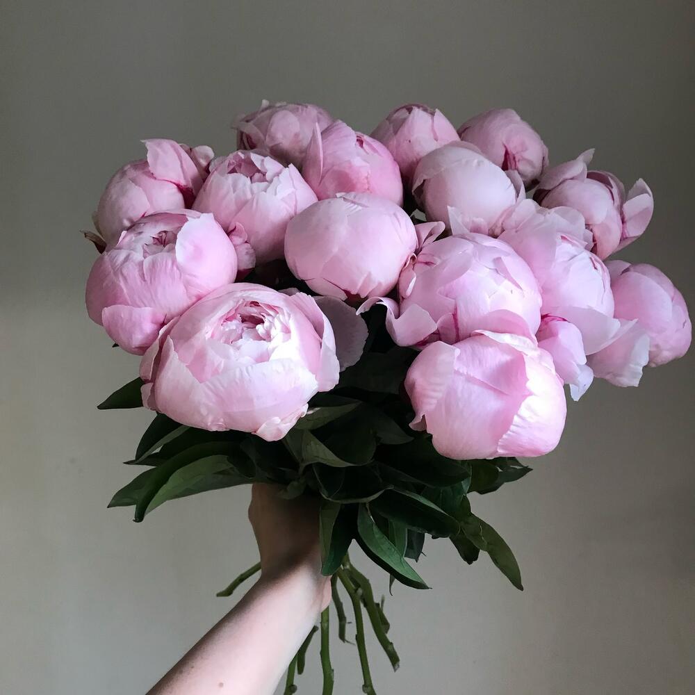15 нежно-розовых пионов, перевязанных лентой