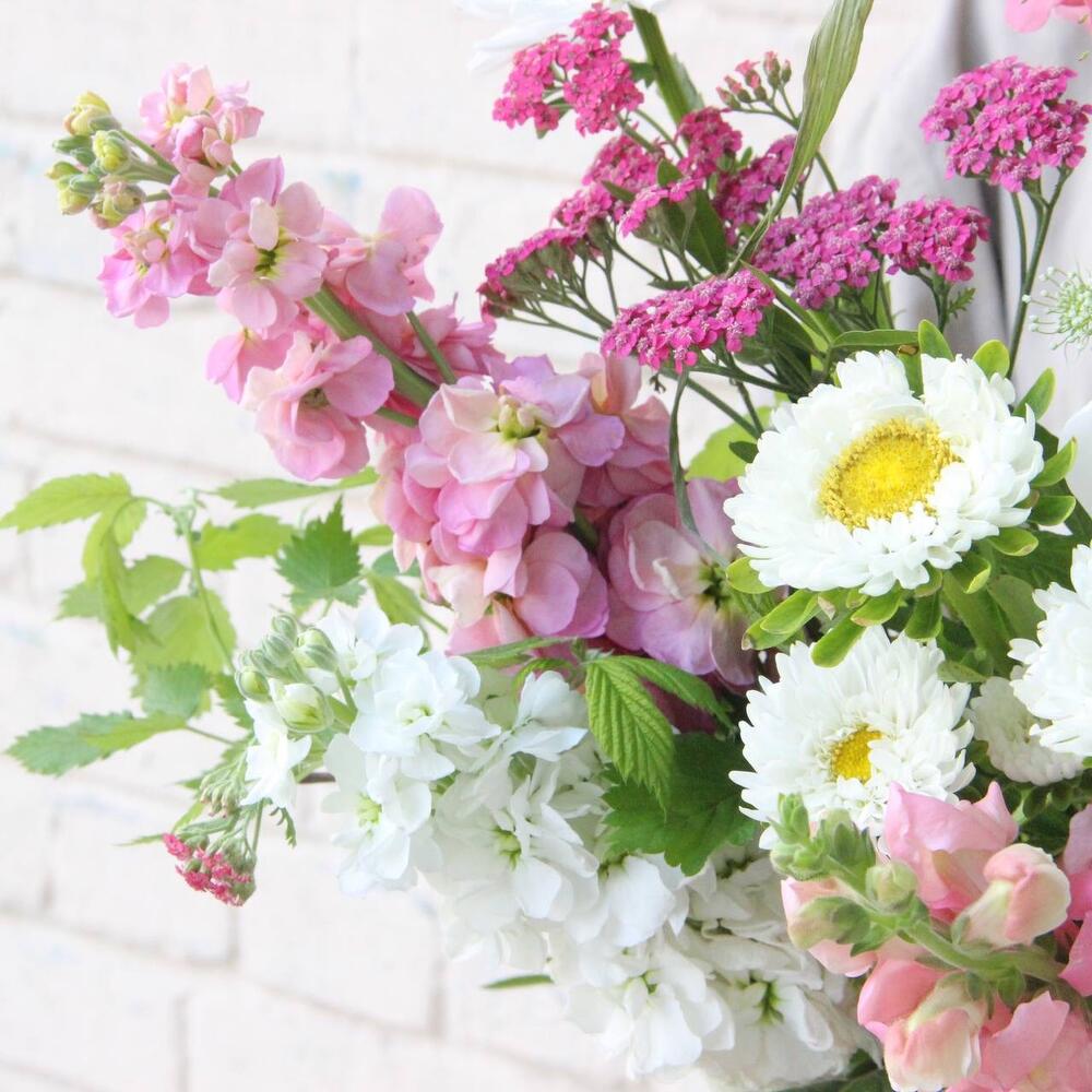 Пион – 3 шт.Колокольчик – 2 шт.Ромашка – 3 шт.Астра – 2 шт.львиный – 3 шт.Маттиола – 2 шт.Ахиллея – 2 шт.Паникум – 3 шт.Ветки малины – 4 шт.Фисташка – 2 шт.Лента атласная – 1 шт.