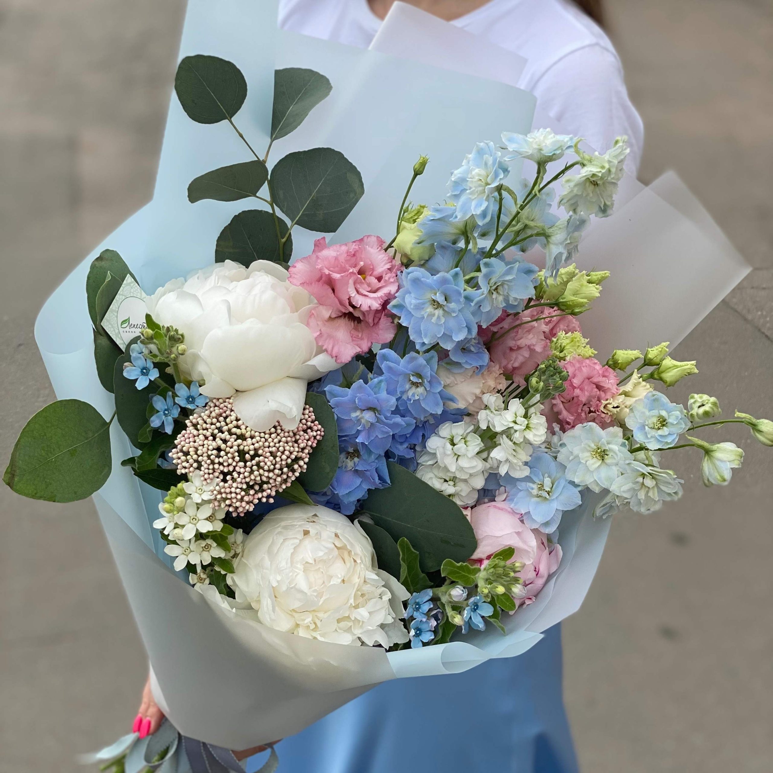 Букет из пионовидных роз, лизиантусов и эвкалипта