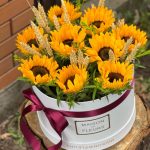 Чудесная композиция в коробке из подсолнухов и декоративными колосками