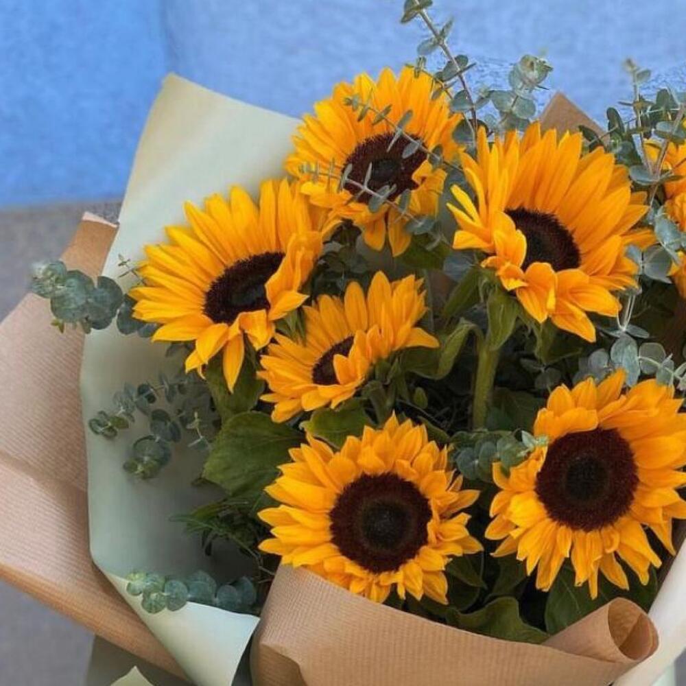 Авторский букет из 7 подсолнухов с эвкалиптом