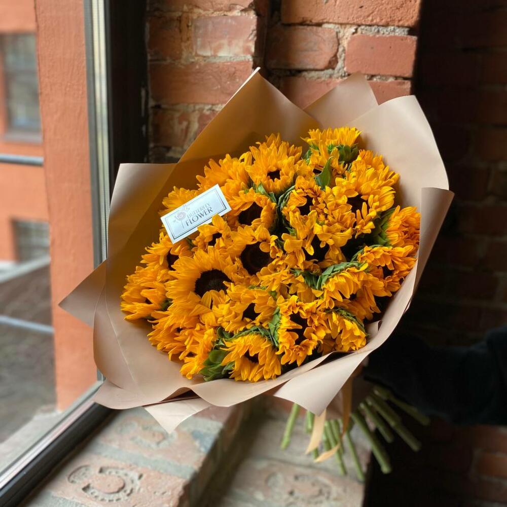 Букет из 27 подсолнухов в стильной упаковке “Аполлон”