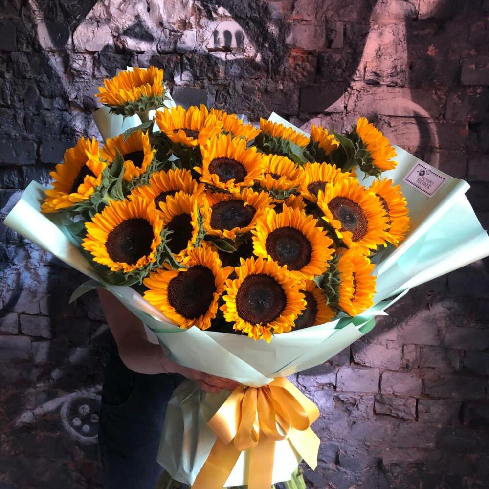 Букет из 27 подсолнухов в стильной упаковке “Энигма”