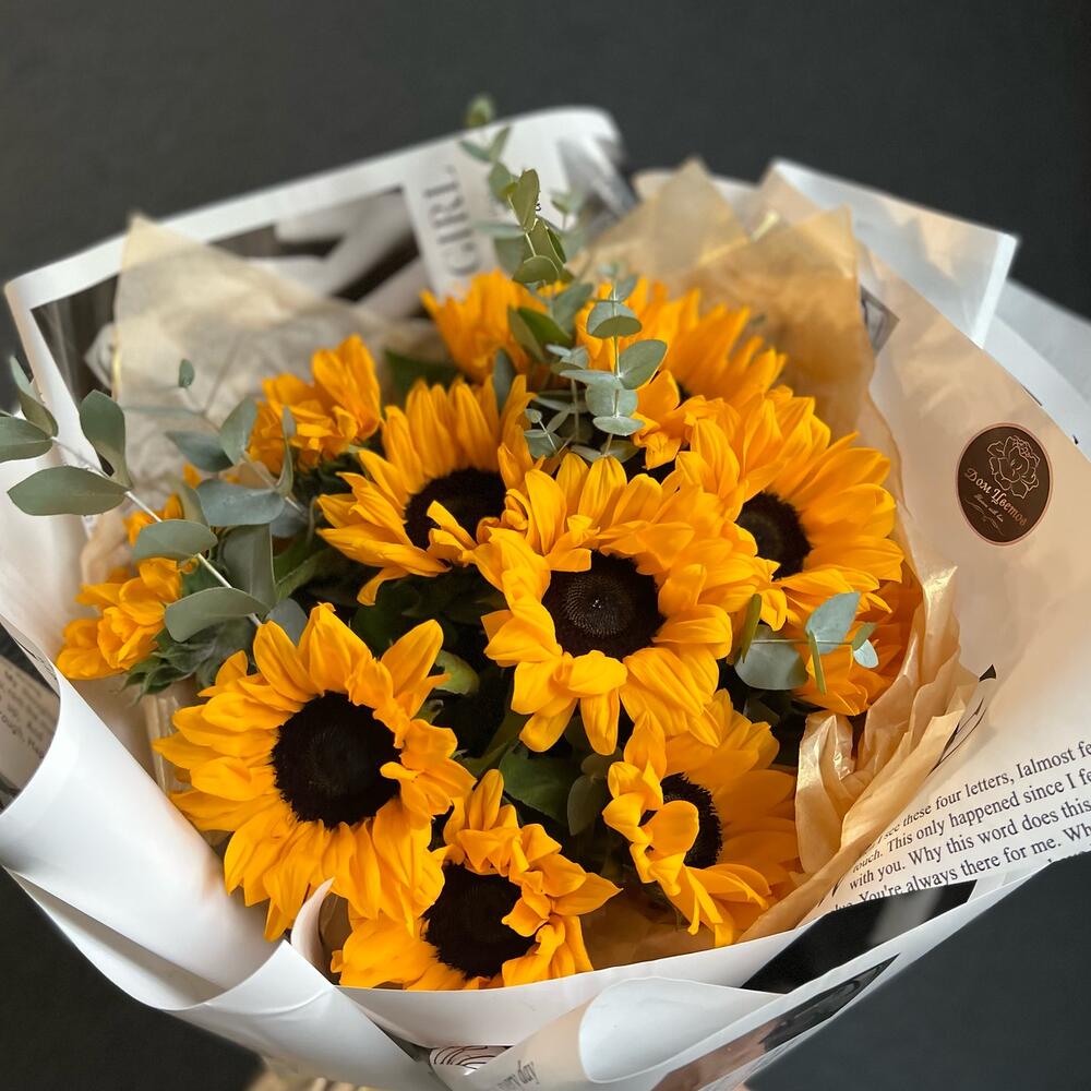 Подсолнух – 11 шт.Эвкалипт – 5 шт.декоративная упаковка – 1 шт.Атласная лента – 1 шт.