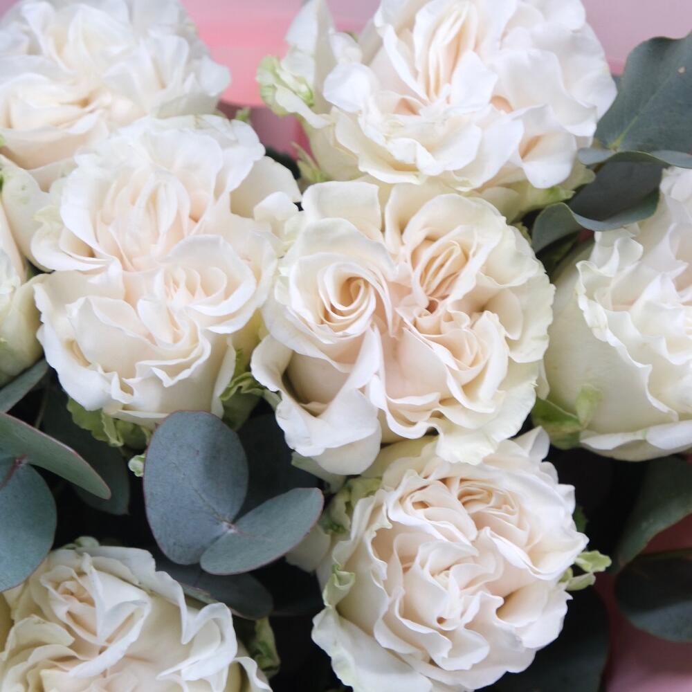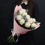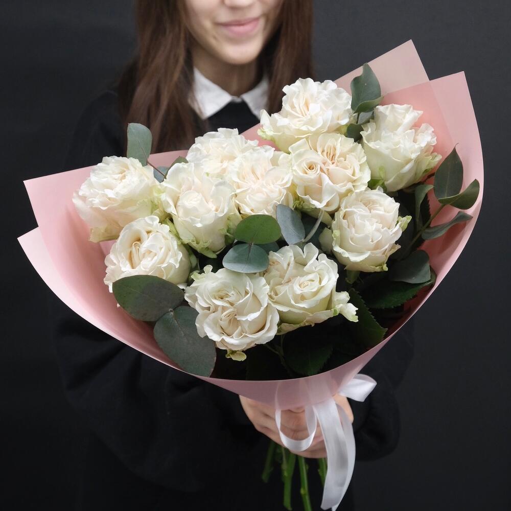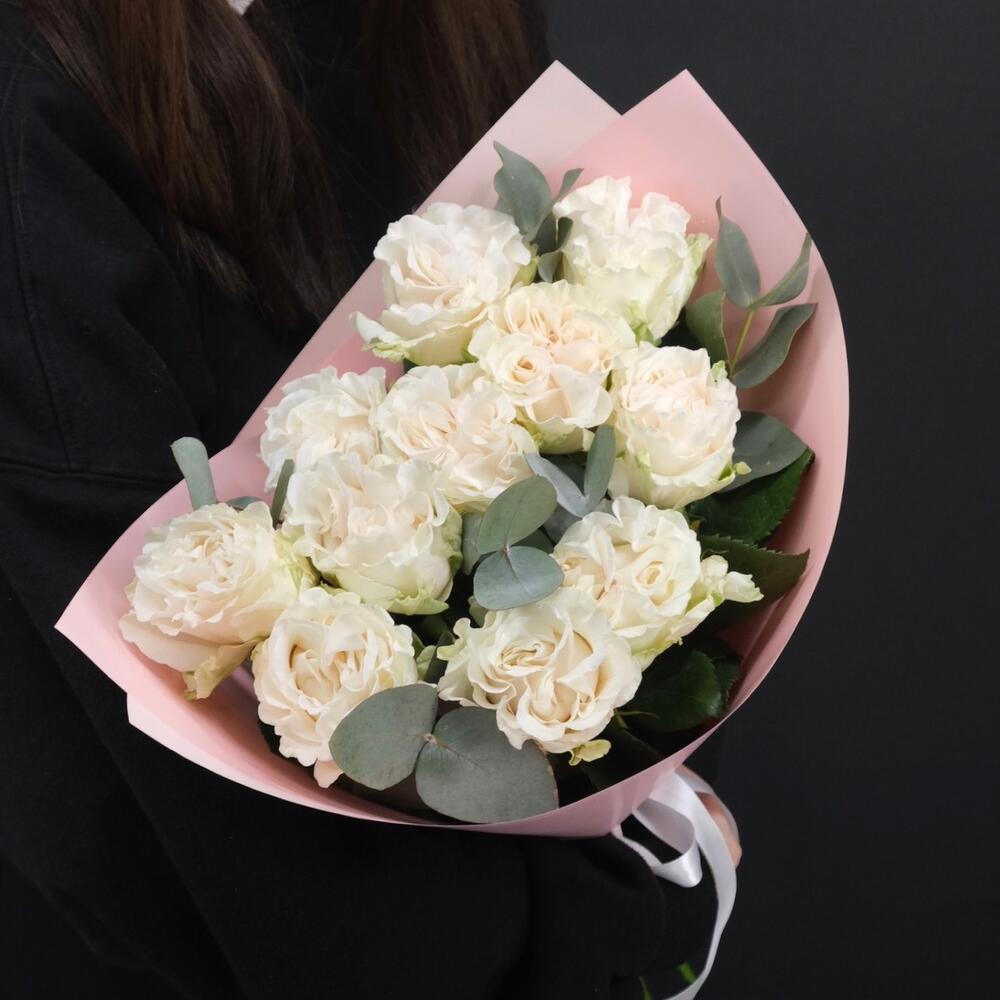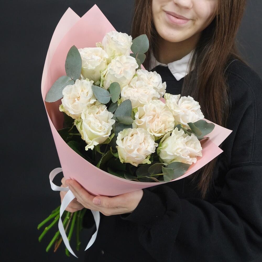 Роза пионовидная – 11 шт.Эвкалипт – 2 шт.Упаковка – 1 шт.Инструкция по уходу – 1 шт.подкормка для стойкости цветов – 1 шт.