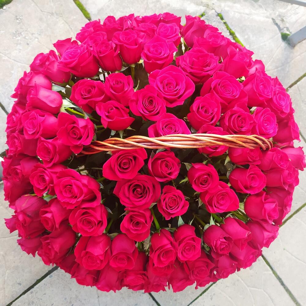 Роза красная – 151 шт.Корзина плетеная – 1 шт.Оазис флористический – 3 шт.