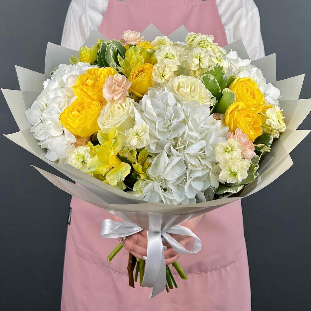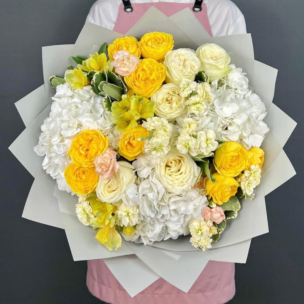 Авторский букет из белой Гортензии и желтых пионовидных Роз