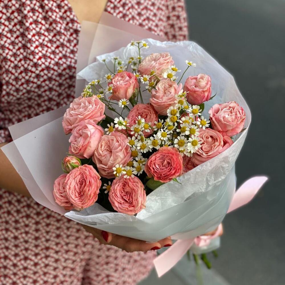 Матрикария – 2 шт.Упаковка дизайнерская – 1 шт.Роза бомбастик кустовая – 3 шт.
