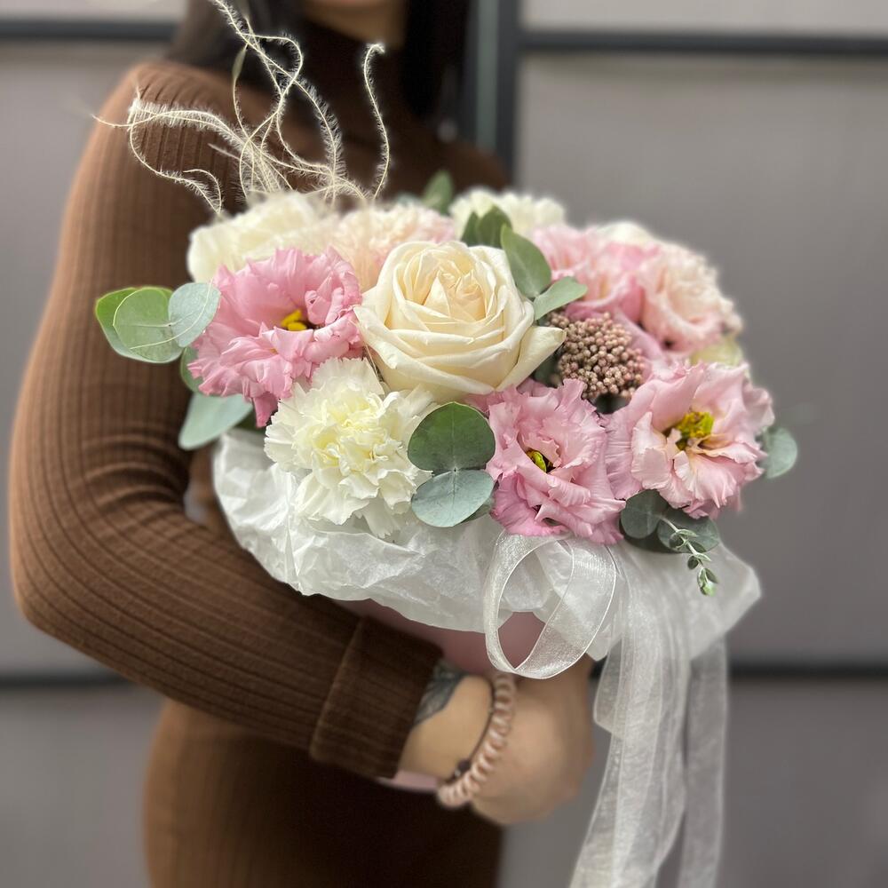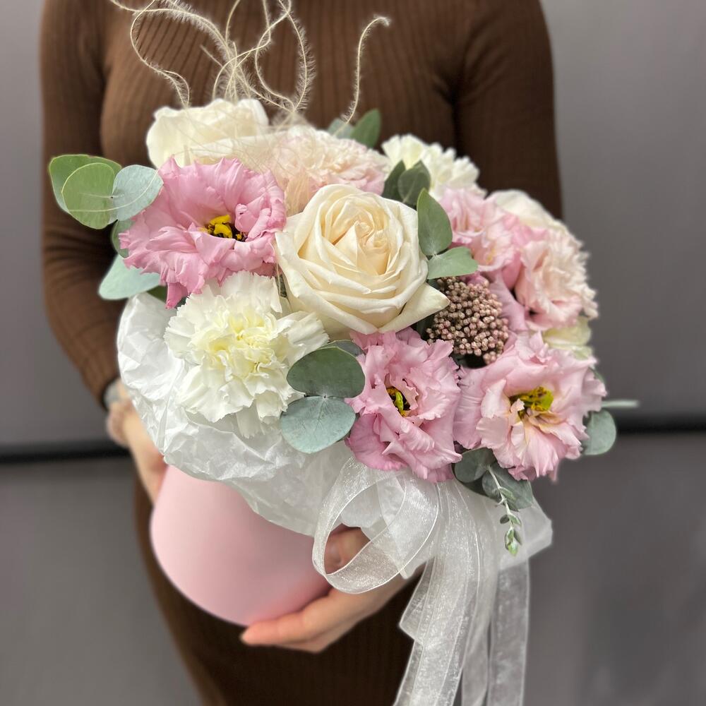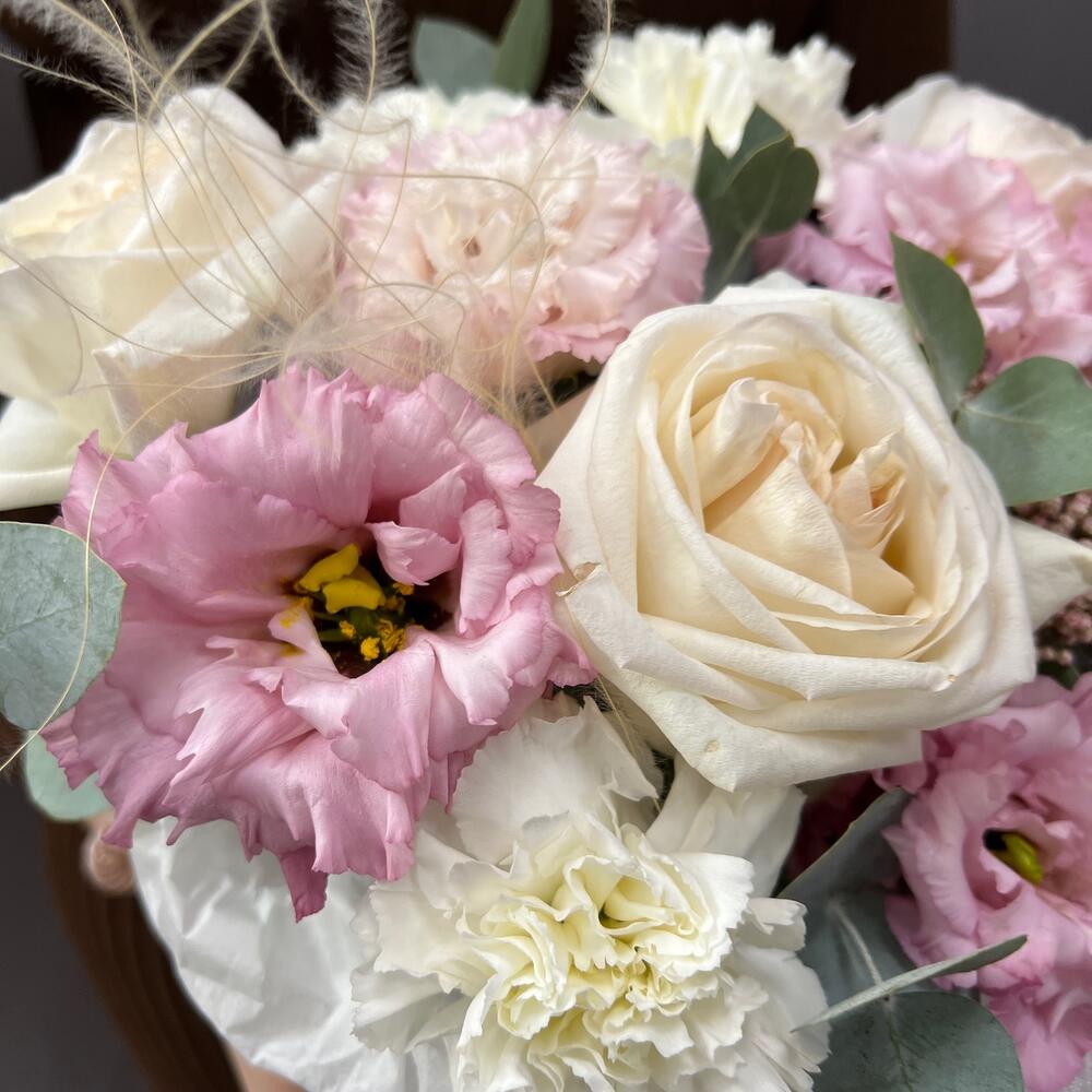 роза пионовидная вайт o’hara – 3 шт.эустома махровая розовая – 2 шт.Диантус – 4 шт.Ковыль – 1 шт.Озотамнус – 1 шт.Эвкалипт – 1 шт.Коробка шляпная – 1 шт.Оазис флористический – 1 шт.Тишью – 1 шт.Лента атласная – 2 шт.