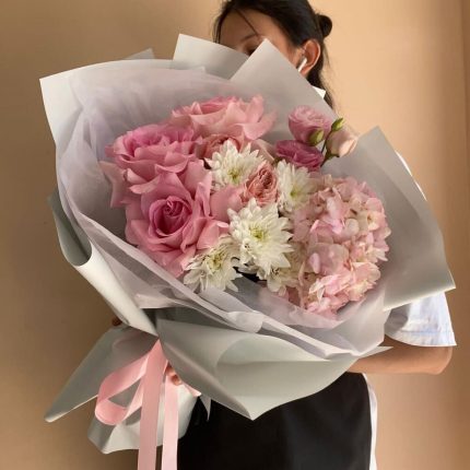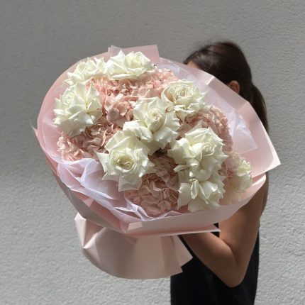 Нежный, волнующий и ароматный букет с гортензией и белыми розами.
