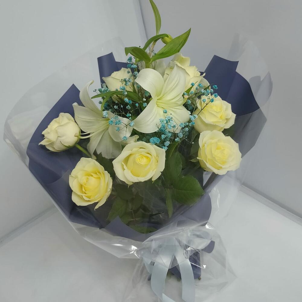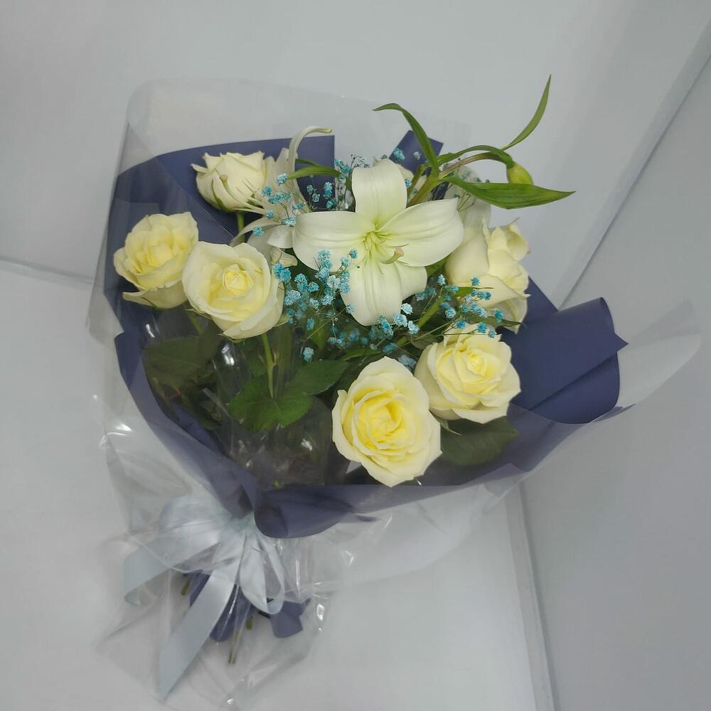 Букет из 7 Роз белых, Лилии и Гипсофилы