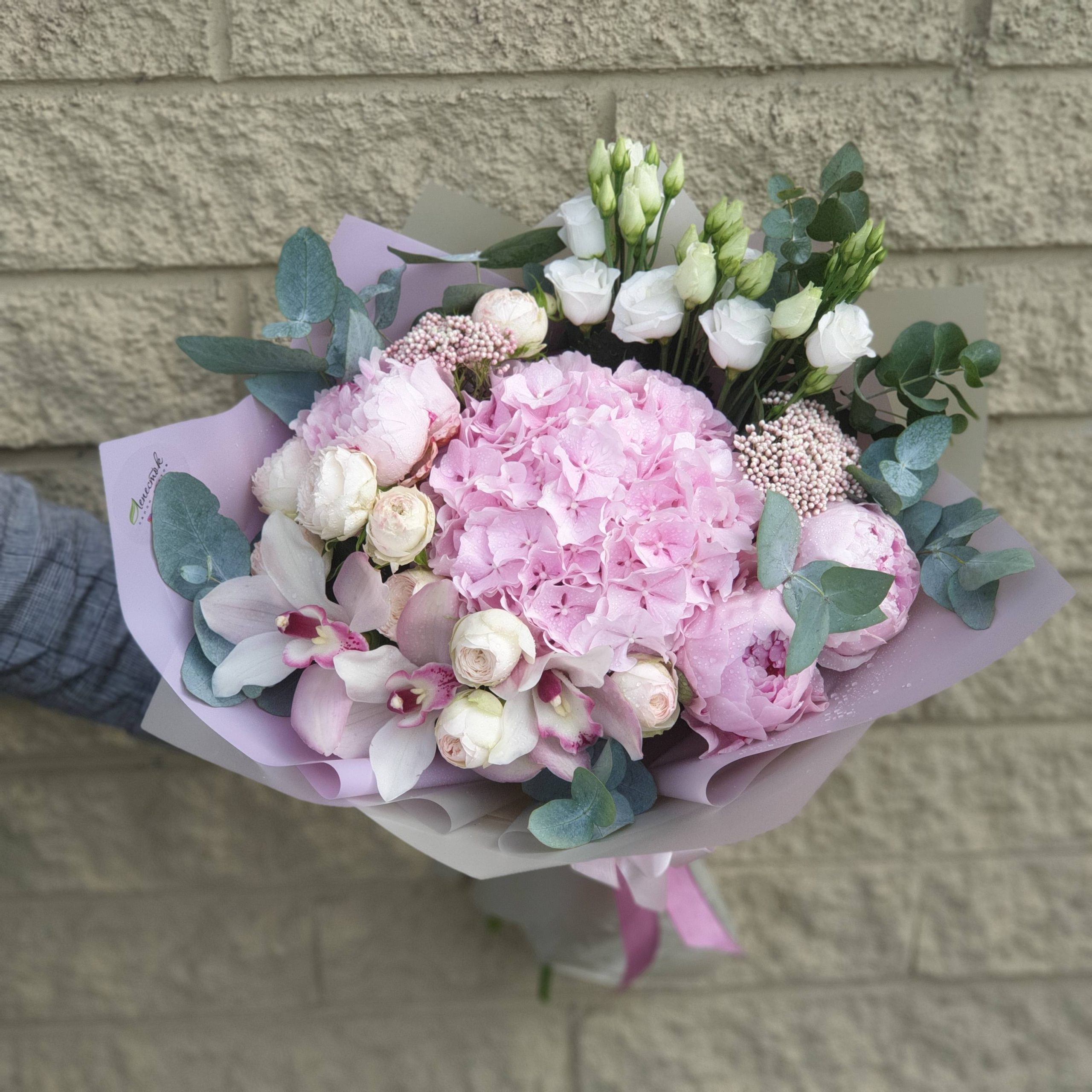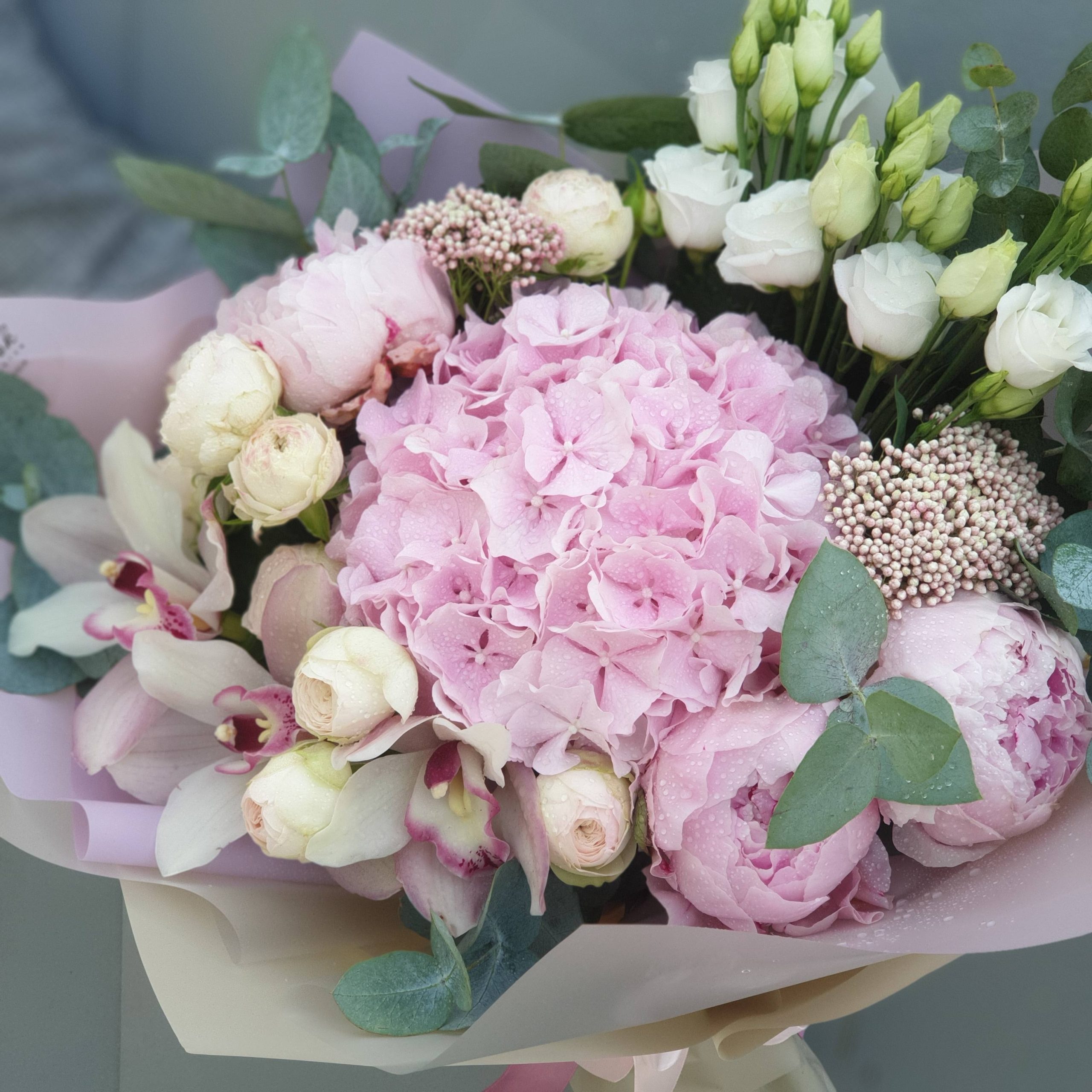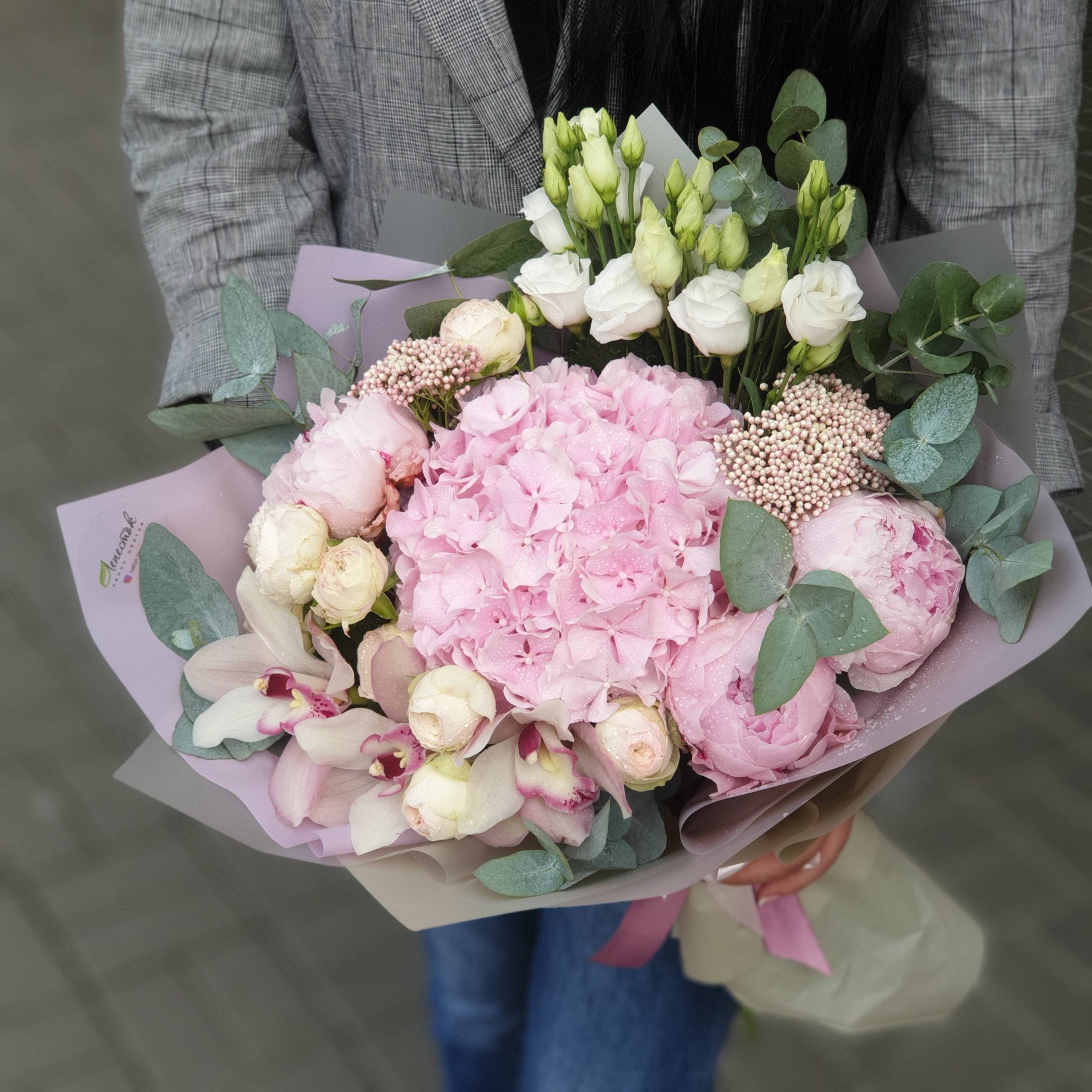 Цветы в коробке с пион розами,сиренью,ранункулюсами,эустомой,тюльпанами,матиолой,пионовидными кустовыми розами