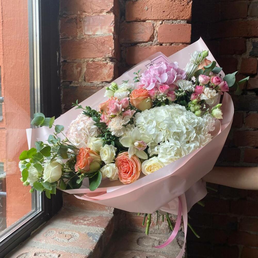 Букет из пионов, гортензий, тюльпанов, сирени и ассорти роз