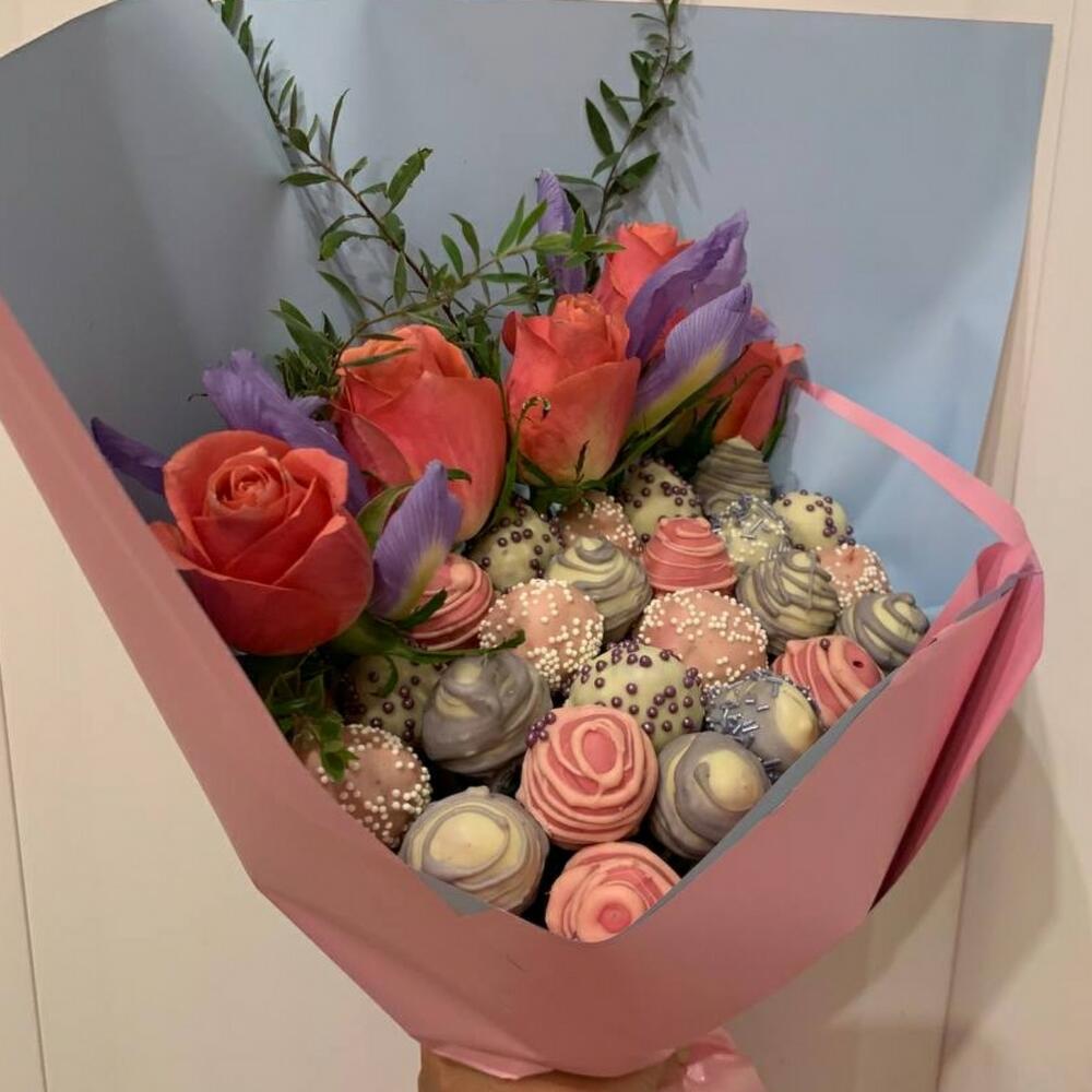Букет “Счастье ” из клубники в шоколаде с цветами