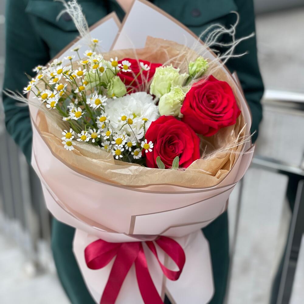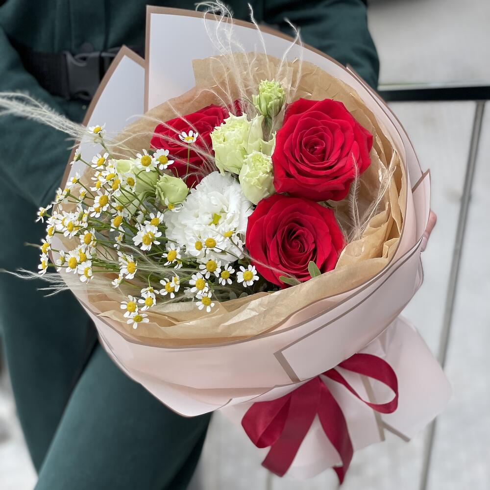 Писташ – 1 шт. Роза красная – 3 шт. Танацетум – 1 шт. Оформление – 1 шт. Стифа – 1 шт. эустома целебрик – 1 шт.