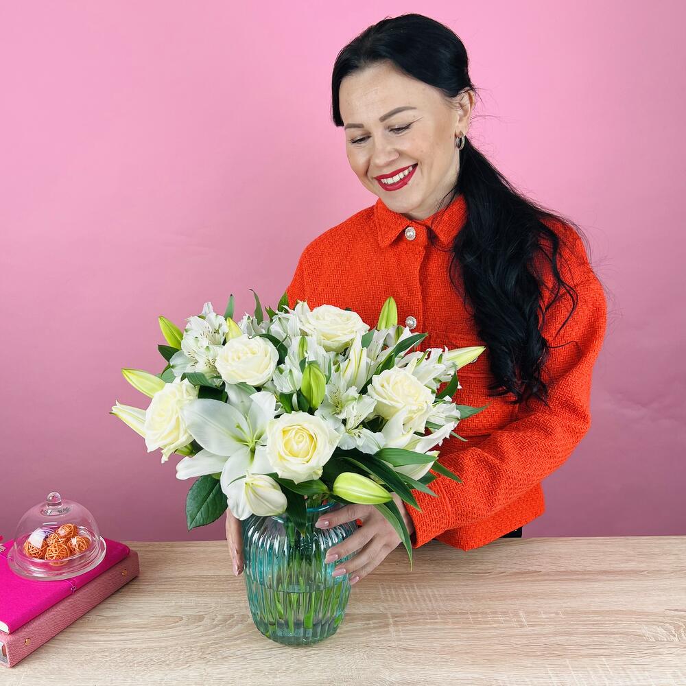 лилия (белый) – 2 шт.альстромерия (белый) – 3 шт.роза одноголовая (белый) – 5 шт.Ваза – 1 шт.