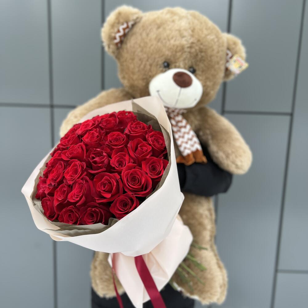 Комбо 35 красных роз + медведь (цвет медведя может отличаться от фото)!