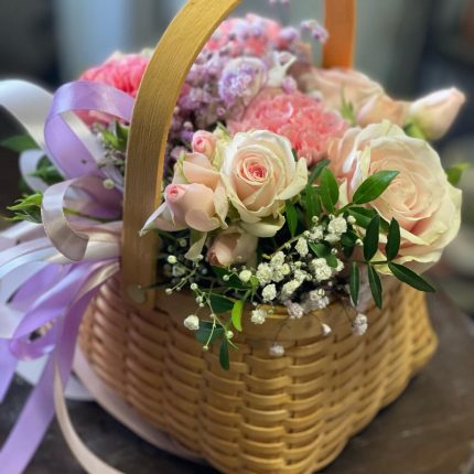 Корзина Прекрасная Иллюзия из роз сорта капучино, фридом, эустомы и кустовых роз