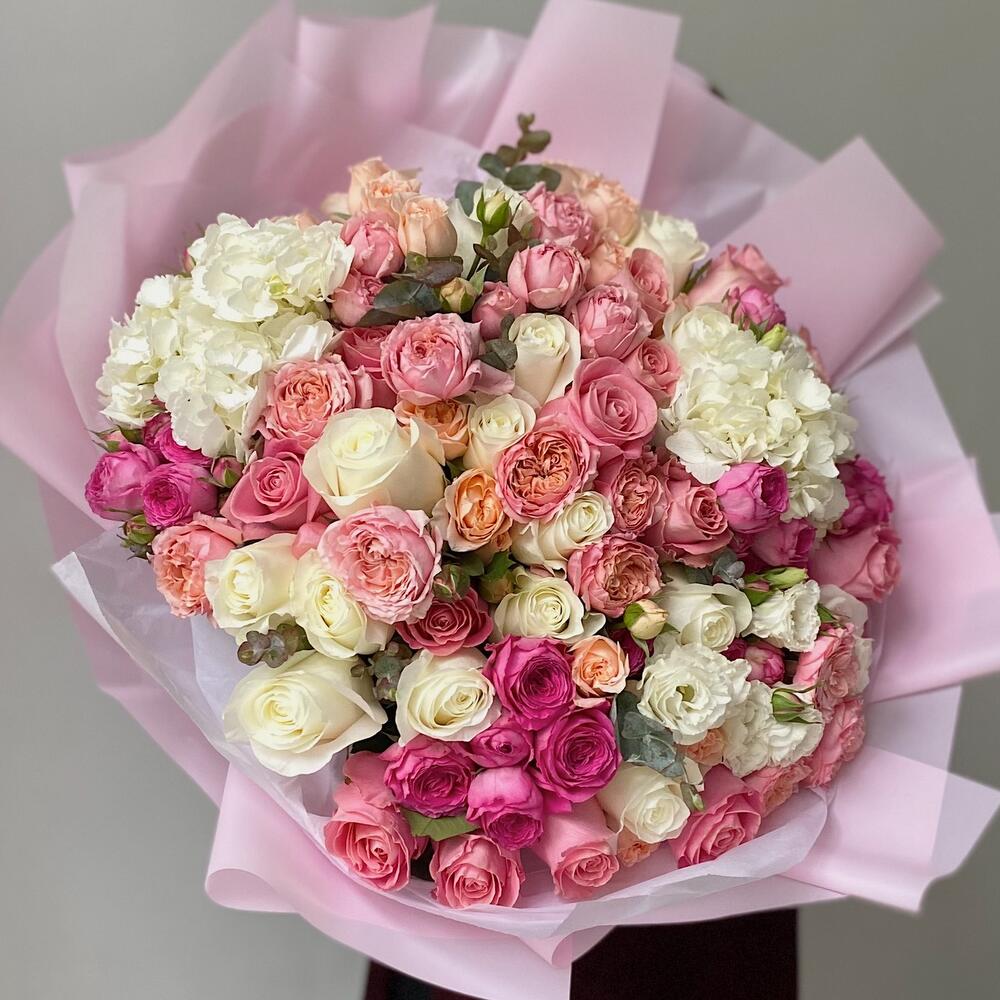 Альстромерии, Кустовые розы, Лизиантусы, Пионовидные розы, Розы, Ромашки