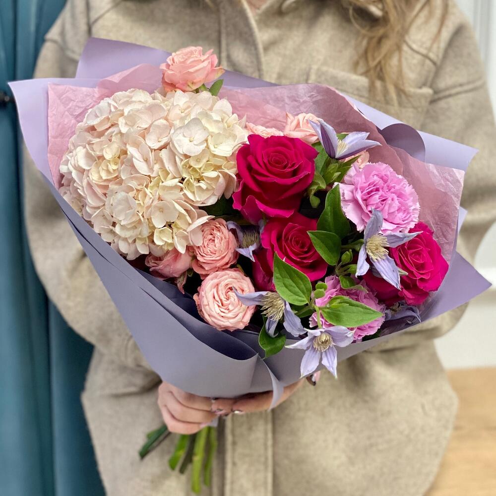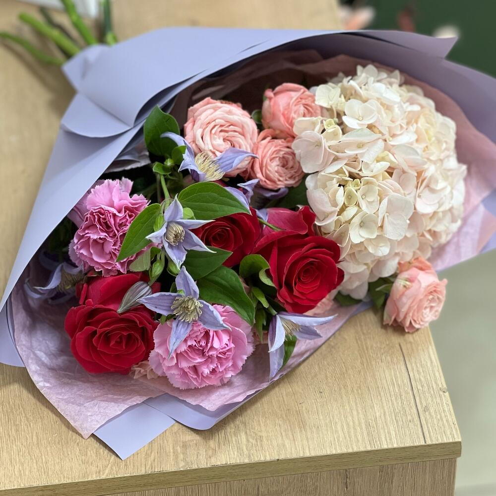 Гортензия – 1 шт.Тишью – 1 шт.Клематис – 2 шт.Пленка матовая – 1 шт.Диантус сортовой – 2 шт.Мадам бомбастик – 2 шт.Роза – 3 шт.