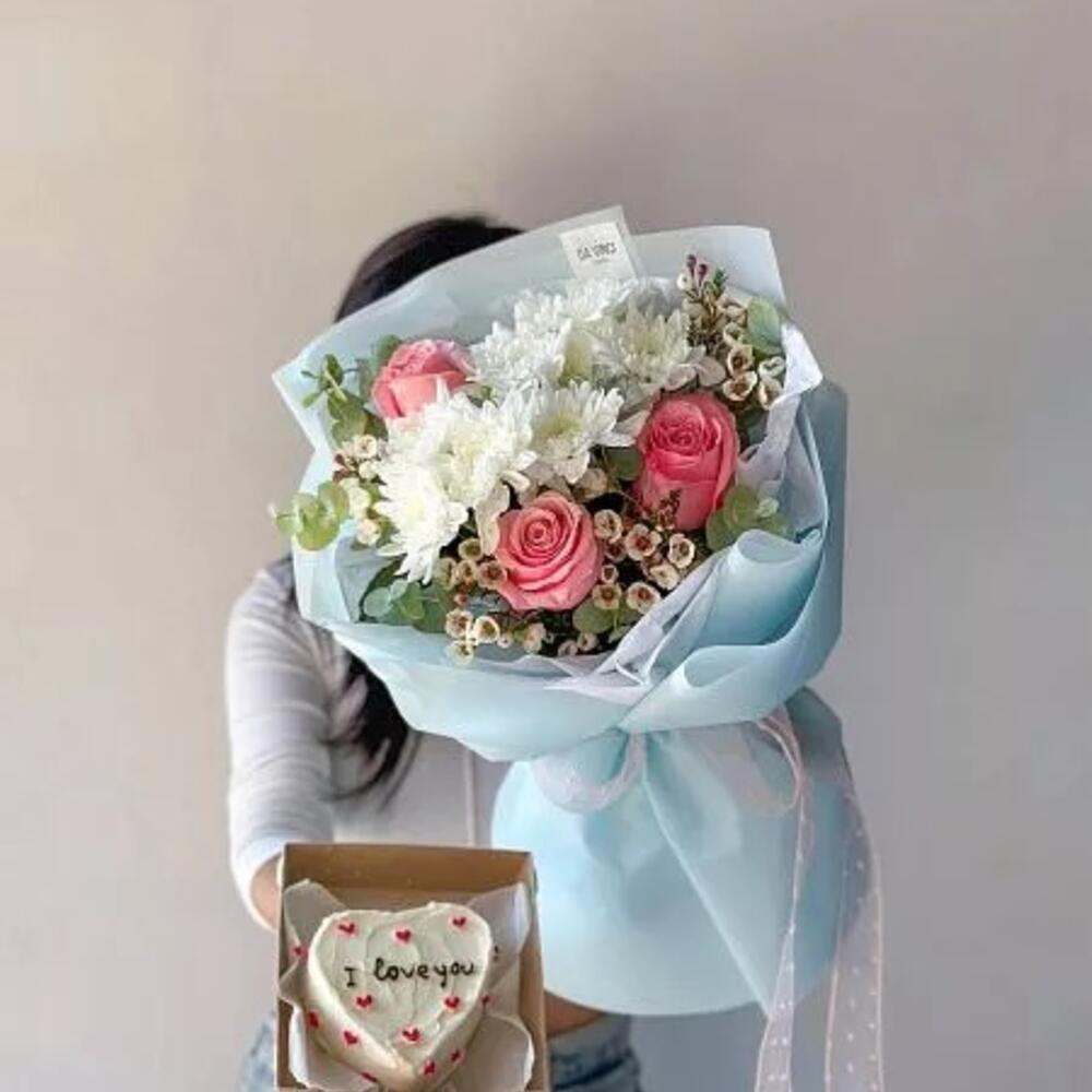 Сет “Forte and cake” Букет с хризантемой, розой и ваксом и бенто тортик