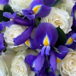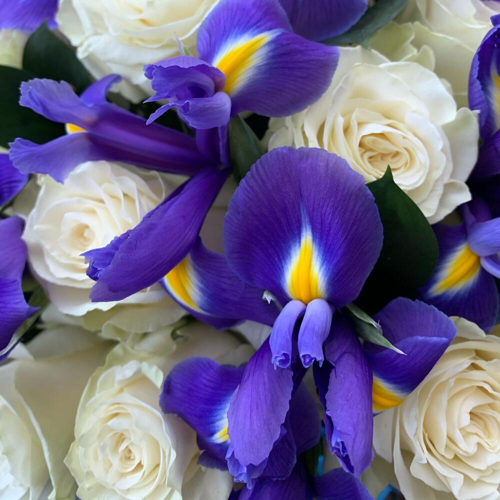Шляпная коробка с белыми розами и ирисами «Восторг»
