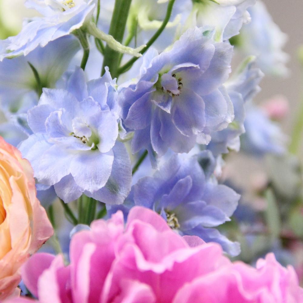 Садовая корзина с дельфиниумами, пионами, пионовидными розами, львиным зевом, сиренью и эвкалиптом.