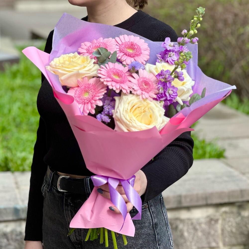 Яркий летний букет с розовыми герберами, крупными розами, маттиолой с приятным ароматом