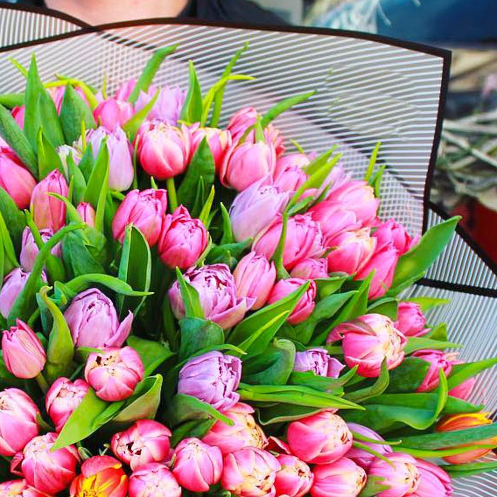 Тюльпан Голландский – 65 шт.Дизайнерская упаковка – 1 шт.Лента атласная – 1 шт.
