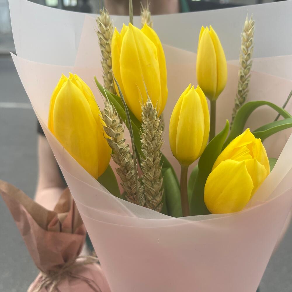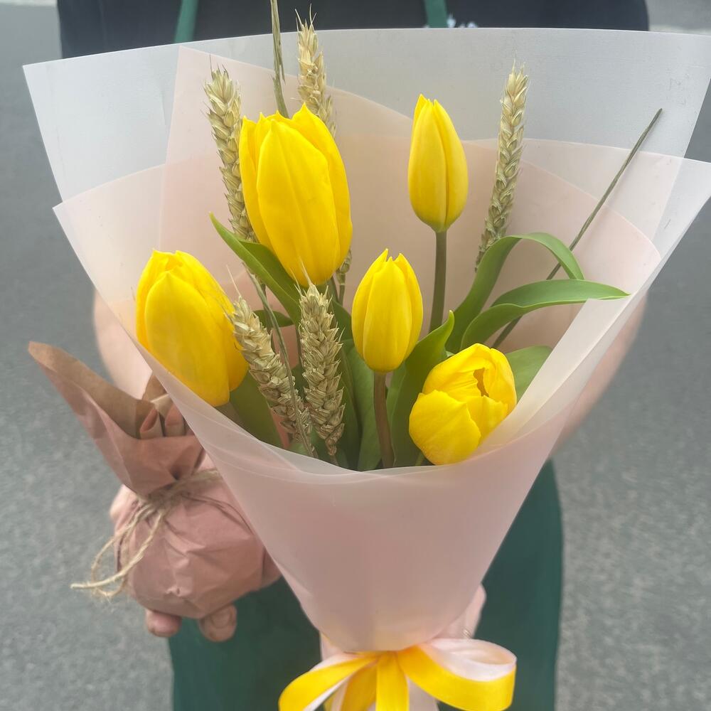 Крафт – 1 шт.Тюльпан желтый – 5 шт.Упаковка корейская пленка – 1 шт.Лента атласная желтая – 1 шт.Лента атласная нежно-розовая – 1 шт.бечевка натуральная – 1 шт.пшеница сухоцвет – 5 шт.ароматное яблоко – 1 шт.